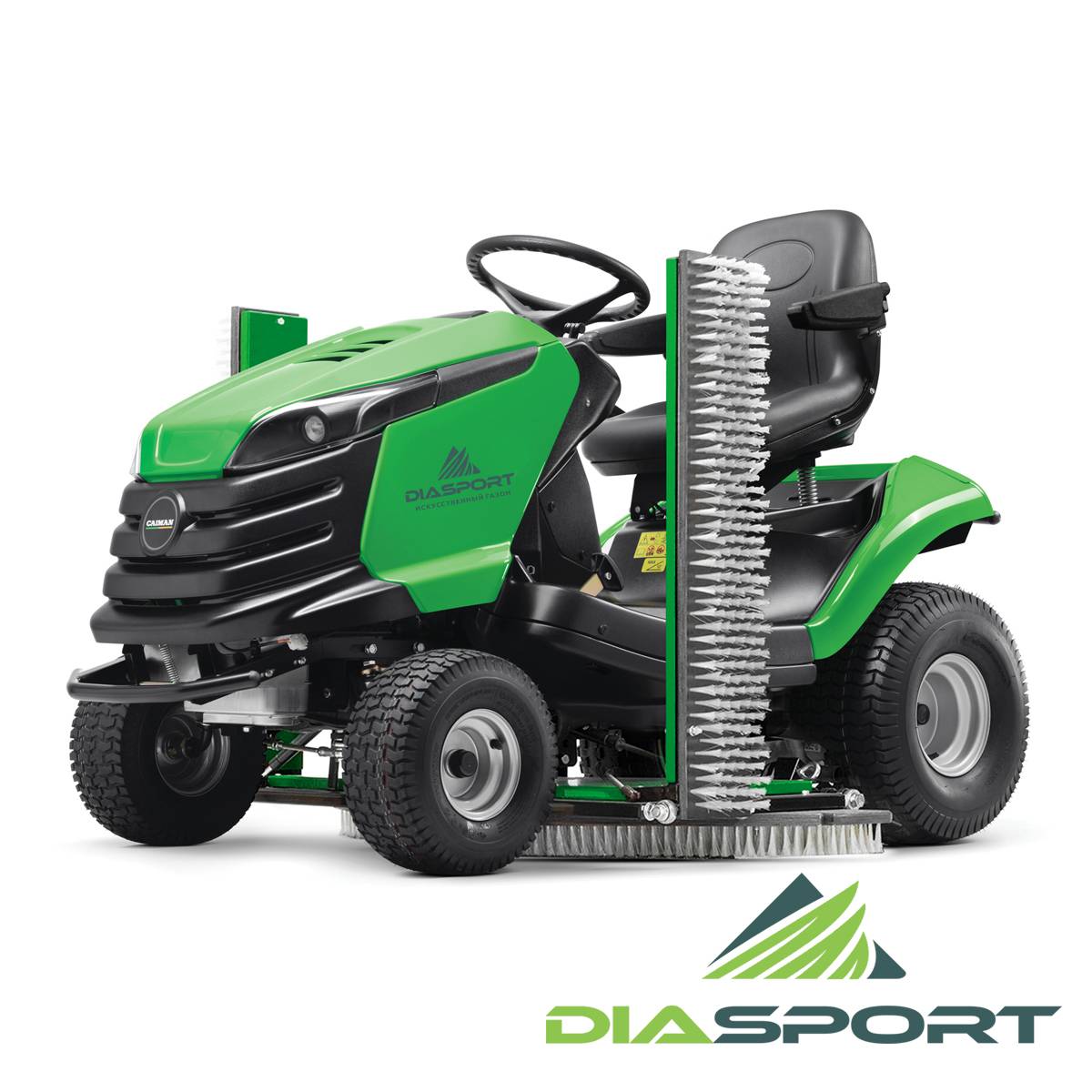 Данное решение на базе садового трактора CAIMAN (Чехия) и Деки для обслуживания искусственного газона, позволяют обслуживать футбольные поля с искусственным газоном без применения тяжелых машин и прицепных устройств, что уменьшает давление на основание, позволяет экономить бюджет и место стоянки техники.